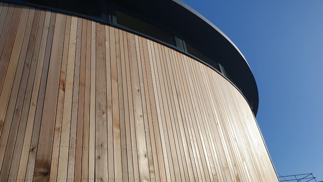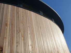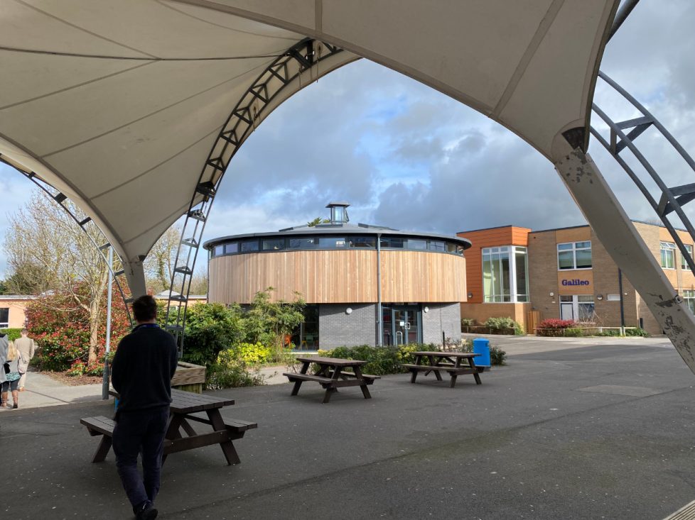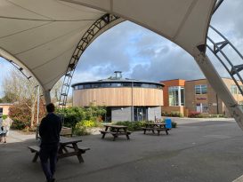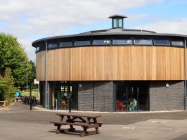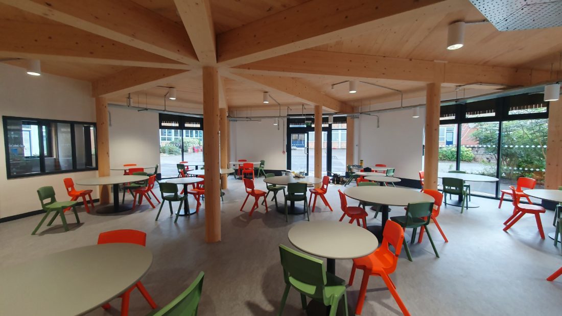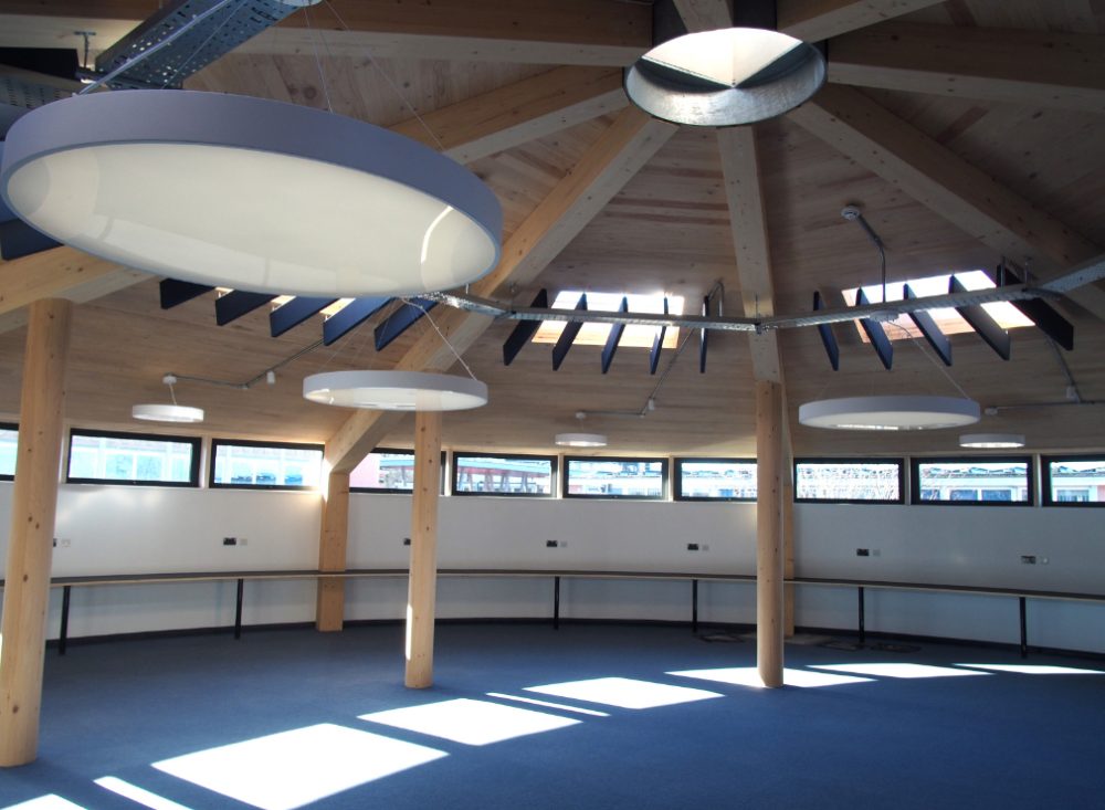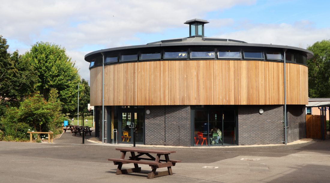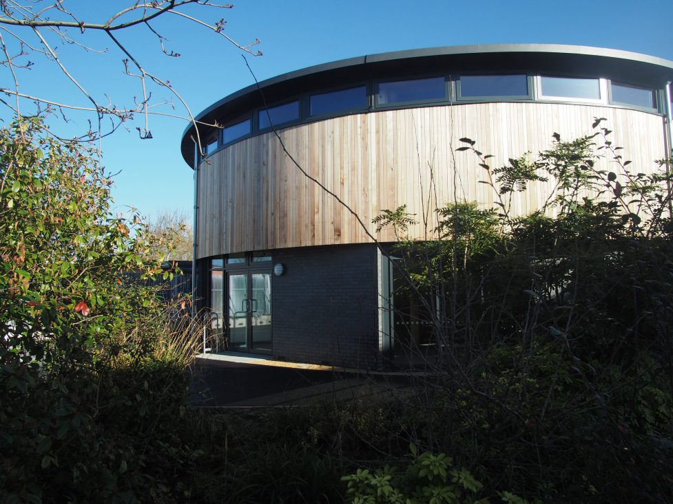 Externally, the drum-shaped structure has an octagonal brick base wrapped in timber cladding, aluminium-framed glazing, and is capped with a generous roof overhang. The material palette complements the nearby existing red-brick buildings, and completes the sixth form cluster.